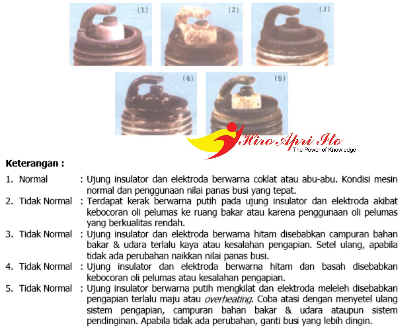 - Memeriksa warnanya dari hasil proses pembakaran yang dibagian ujung insulator dan elektroda busi. Perhatikan pula pada kode busi yang dipergunakan, bandingkan dengan spesifikasi yang telah disarankan.